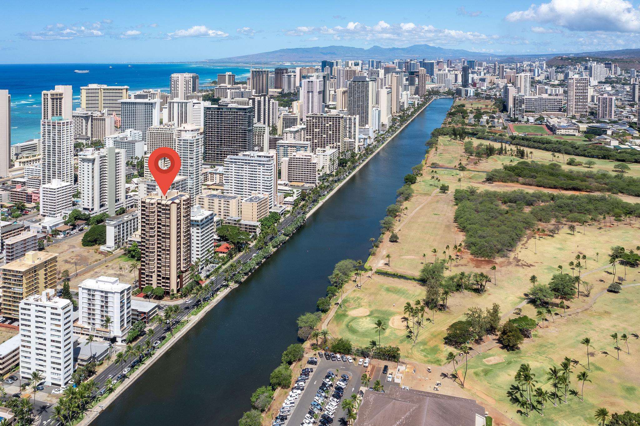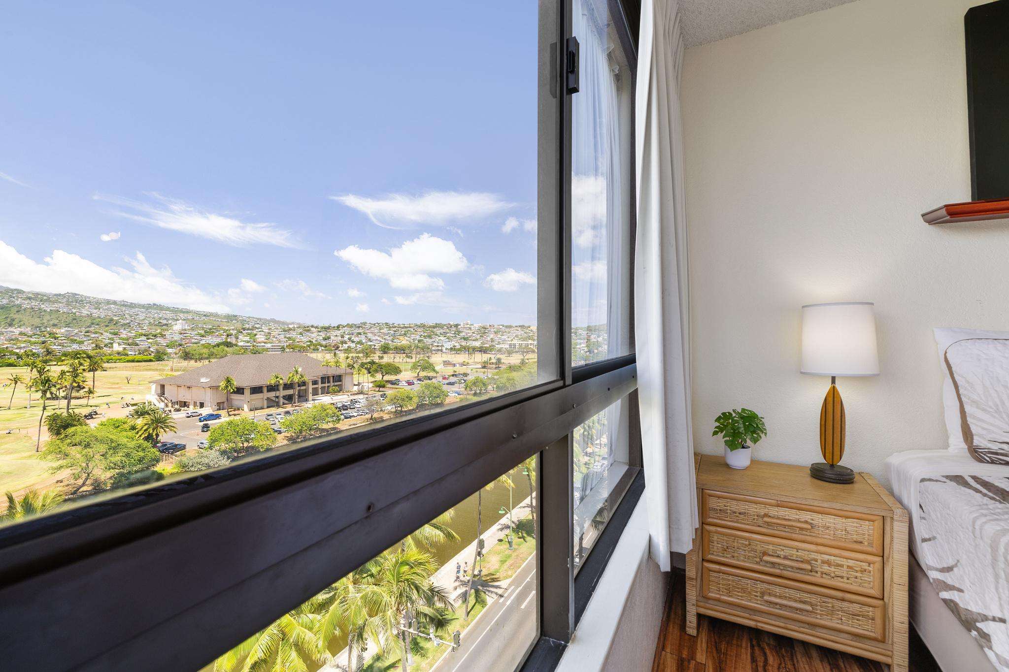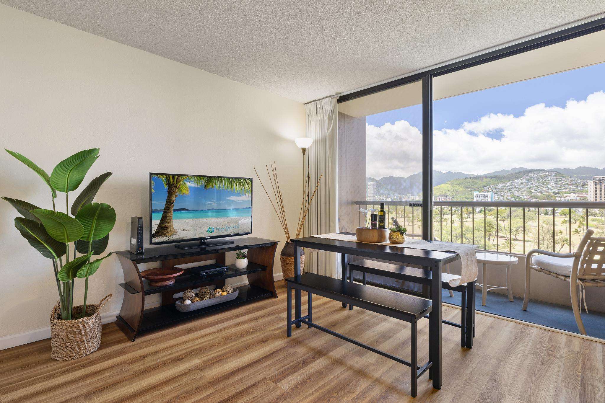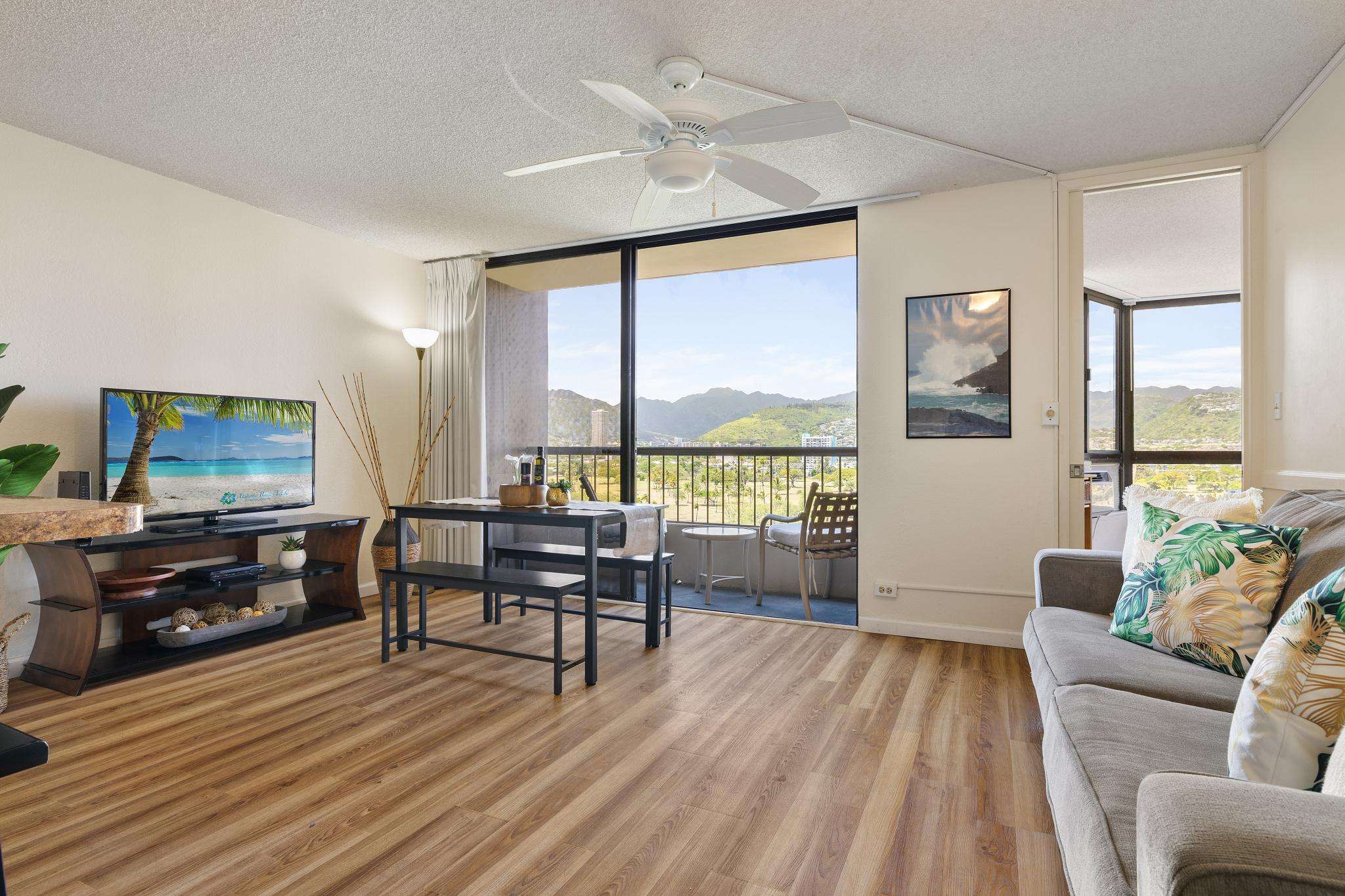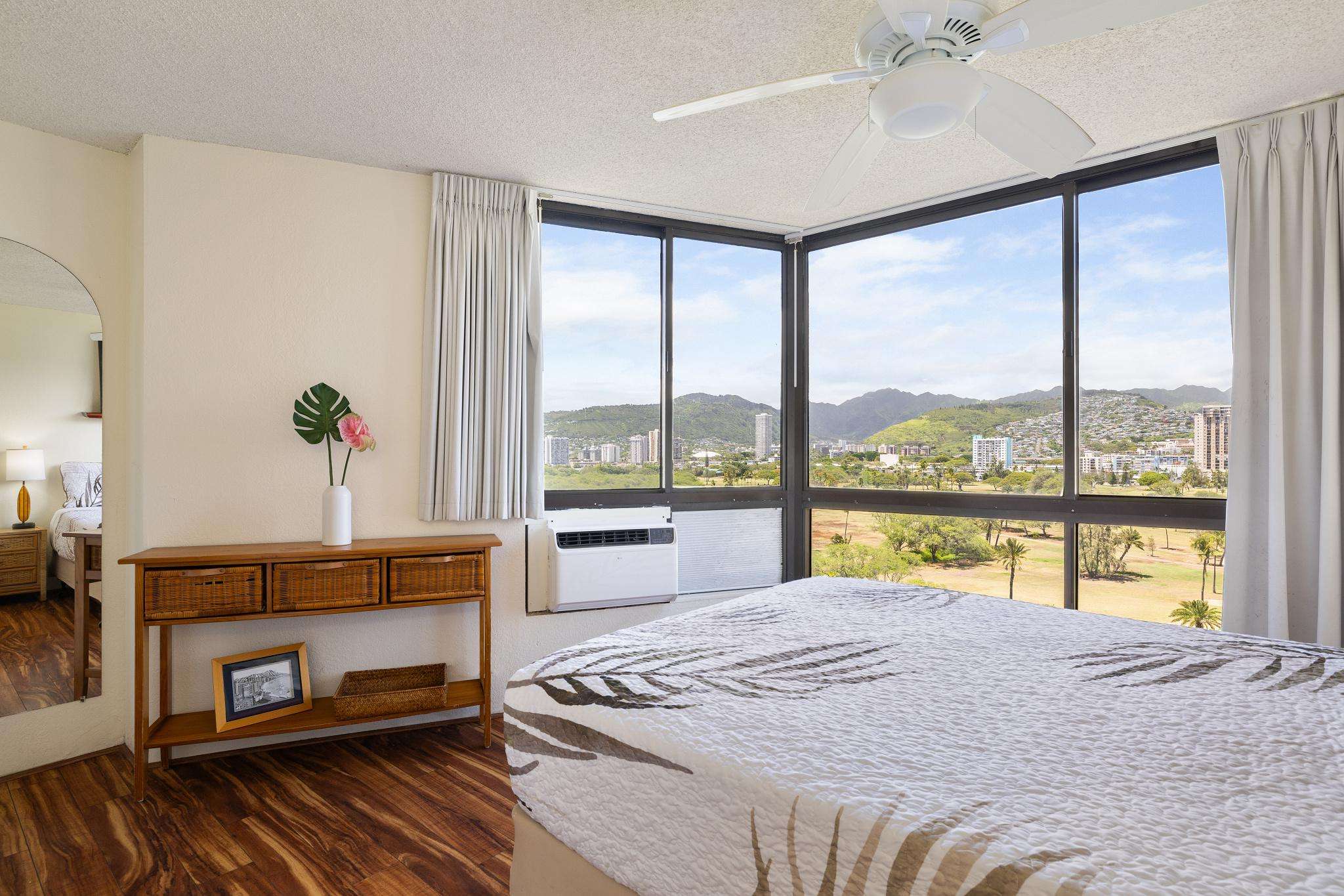 **THIS IS A LEGAL VACATION RENTAL** Alohana Monte Vista 1005. 10th floor 2 Bedroom - Free Wifi, Cable TV & Free Parking. Located beside the Ala Wai Canal this 2 bedroom1 bath condo at the Monte Vista features stunning views of the Ko'olau Mountain range looking across the Ala Wai golf course. The condo has hardwood floors throughout and features a "Jack and Jill bathroom"*. The master bedroom has a queen size bed and a window AC, and the second bedroom has 2 twin beds. The living room has a queen size sleeper sofa with a memory foam mattress, a ceiling fan and a 46" flat screen TV. The full-size kitchen is equipped with a dishwasher, 4 burner stove with oven, refrigerator, dining table and a laundry center. There's a pool area with charcoal BBQ and an ocean view but we've also provided 2 backpack beach chairs for adventures on the beach and outdoors!