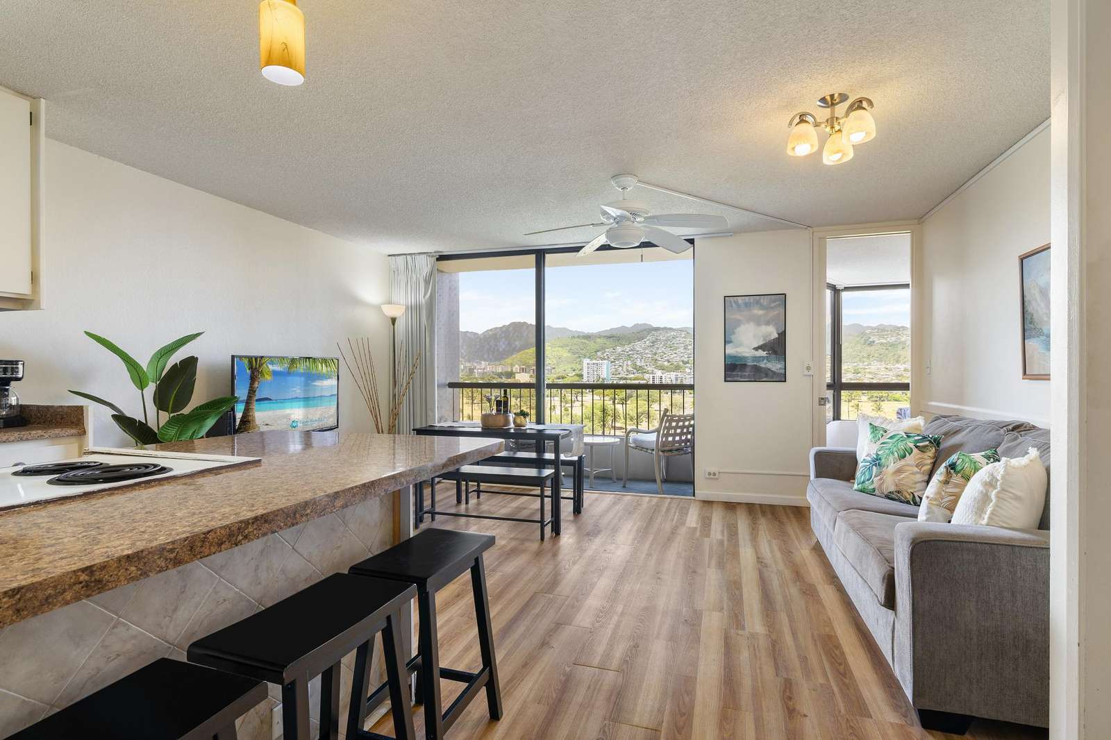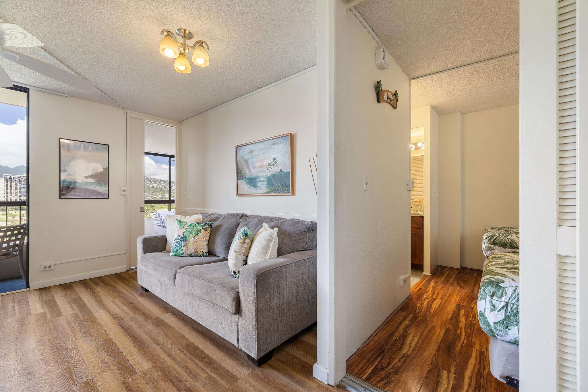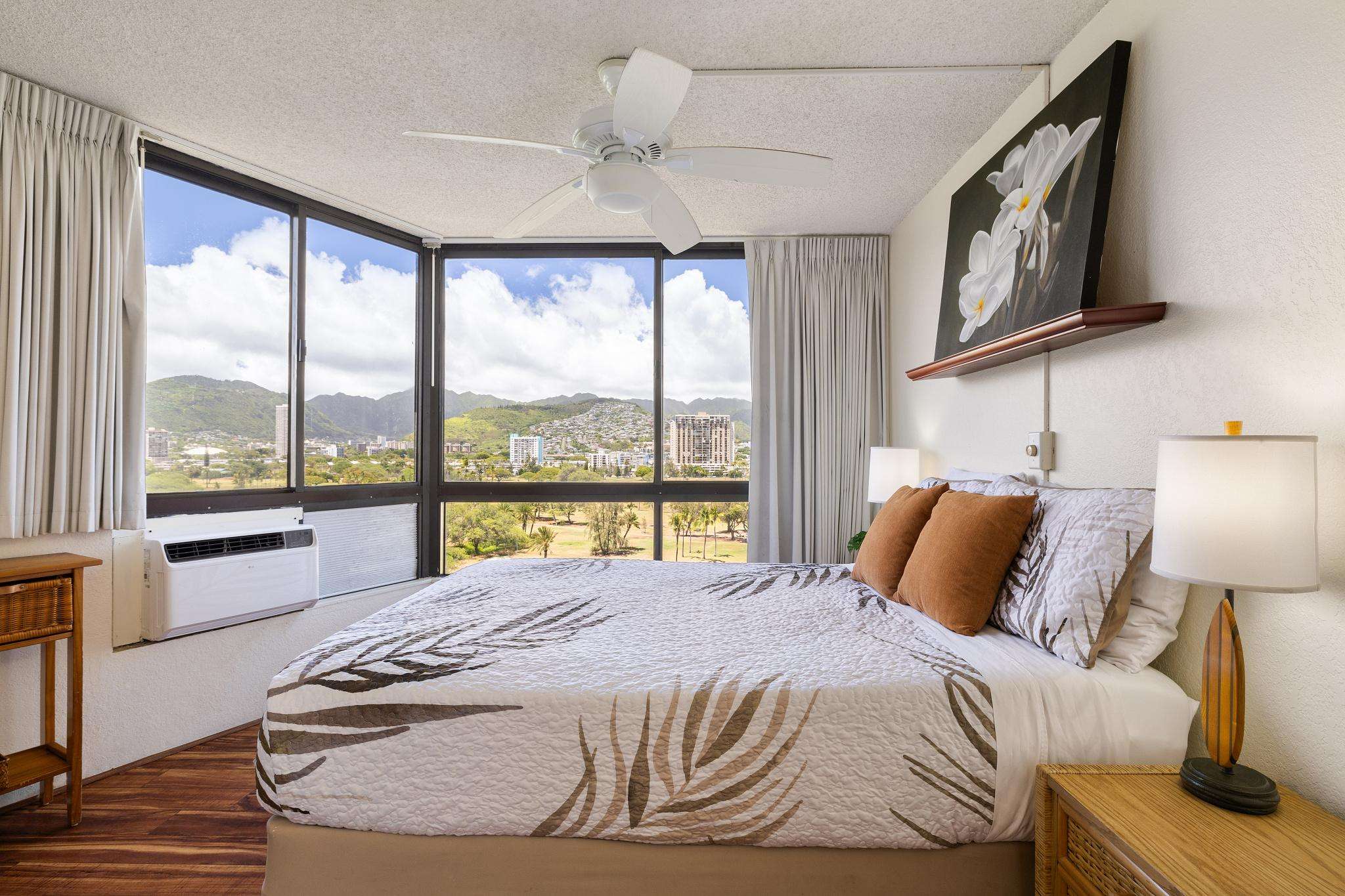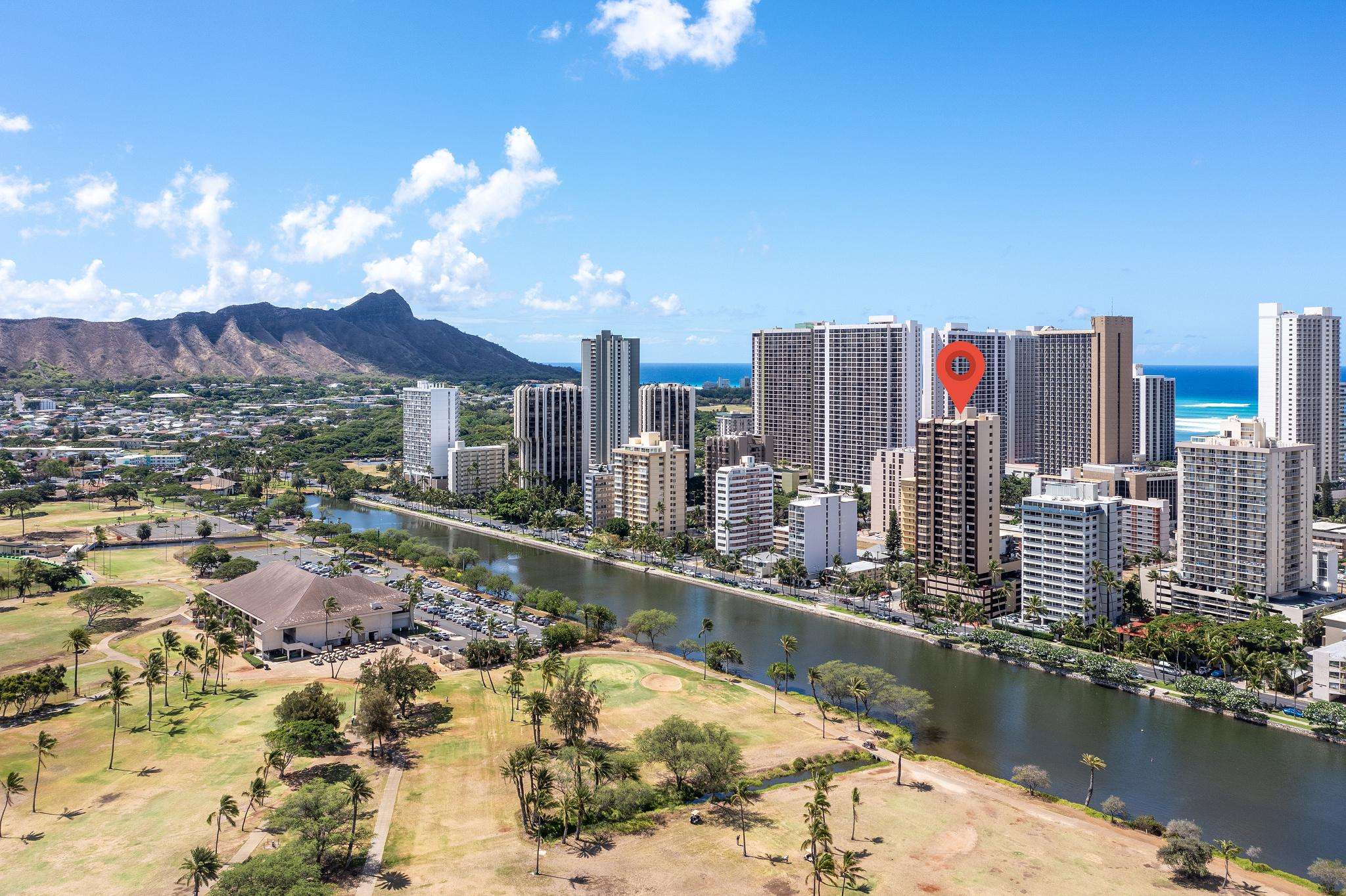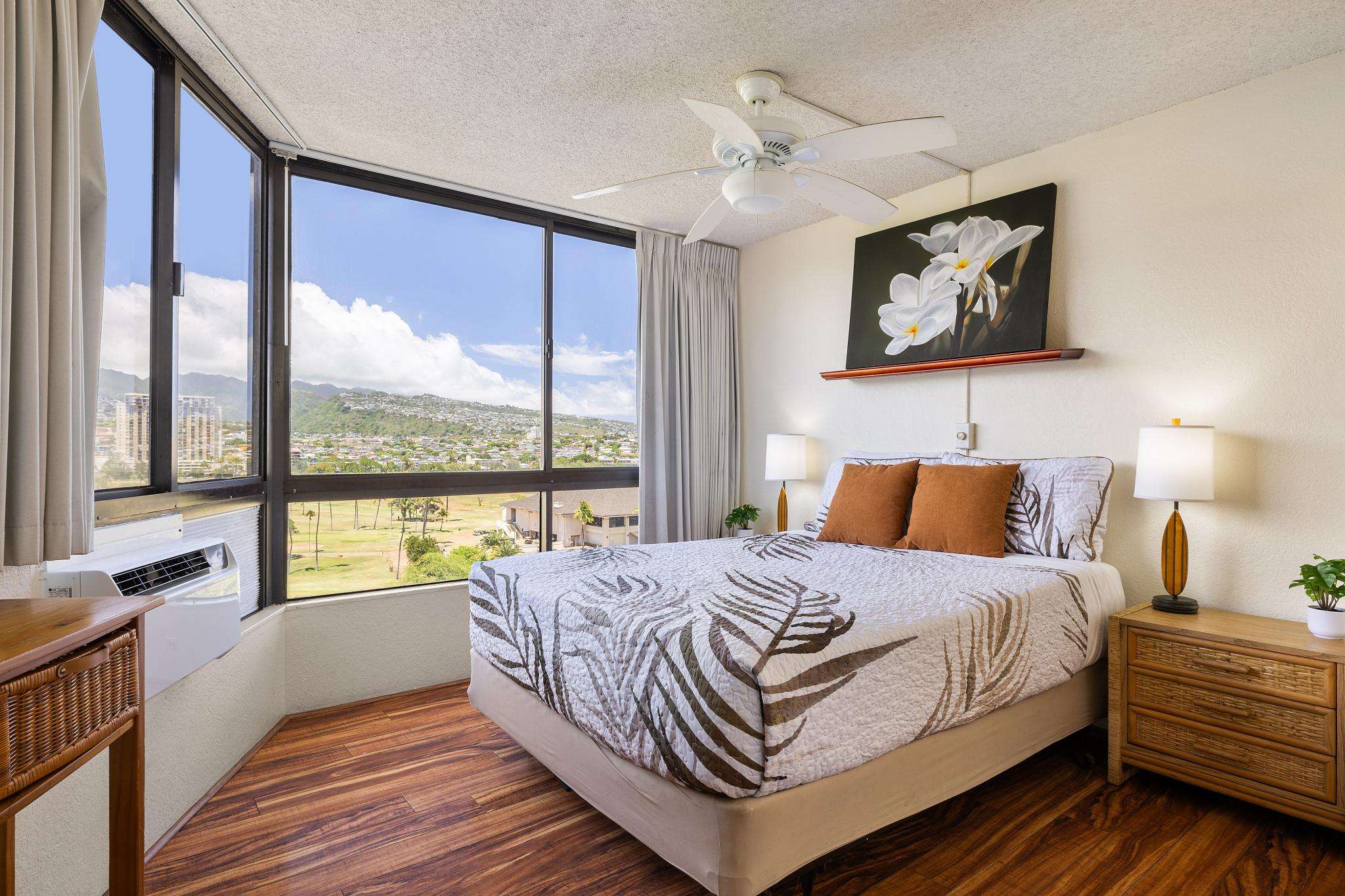 **THIS IS A LEGAL VACATION RENTAL** Alohana Monte Vista 1005. 10th floor 2 Bedroom - Free Wifi, Cable TV & Free Parking. Located beside the Ala Wai Canal this 2 bedroom1 bath condo at the Monte Vista features stunning views of the Ko'olau Mountain range looking across the Ala Wai golf course. The condo has hardwood floors throughout and features a "Jack and Jill bathroom"*. The master bedroom has a queen size bed and a window AC, and the second bedroom has 2 twin beds. The living room has a queen size sleeper sofa with a memory foam mattress, a ceiling fan and a 46" flat screen TV. The full-size kitchen is equipped with a dishwasher, 4 burner stove with oven, refrigerator, dining table and a laundry center. There's a pool area with charcoal BBQ and an ocean view but we've also provided 2 backpack beach chairs for adventures on the beach and outdoors!