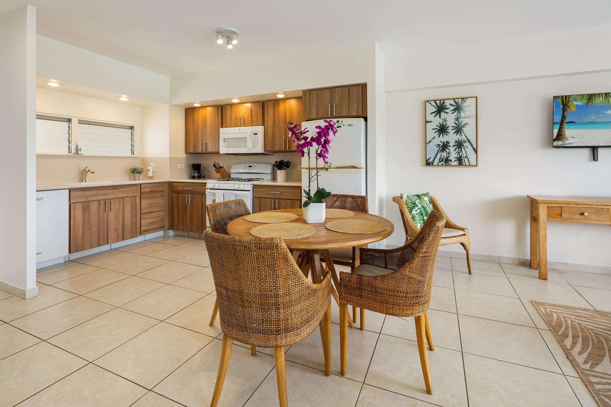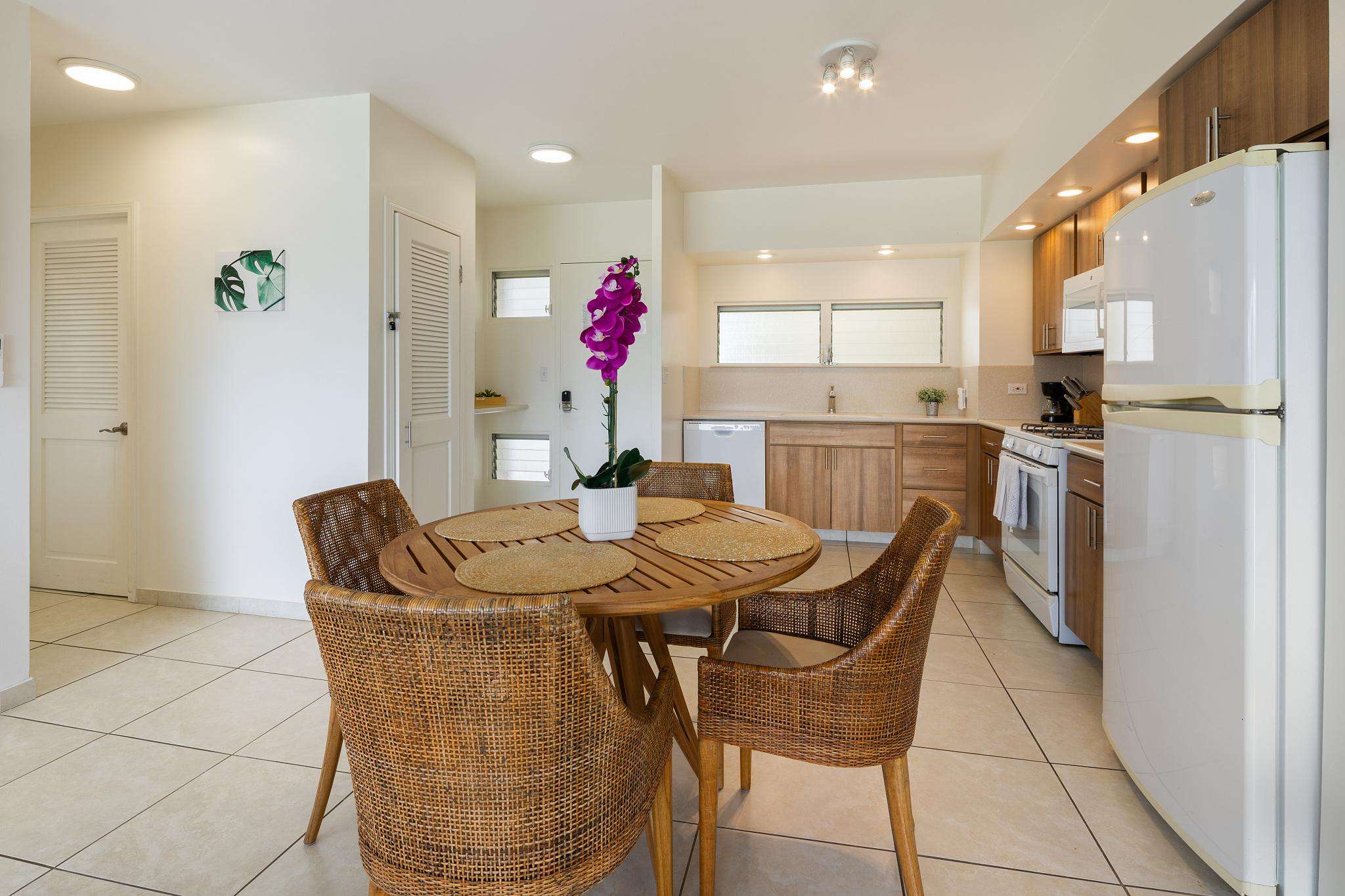 The lanai has a chic rattan chair and a bistro table with two chairs for you to enjoy the view.